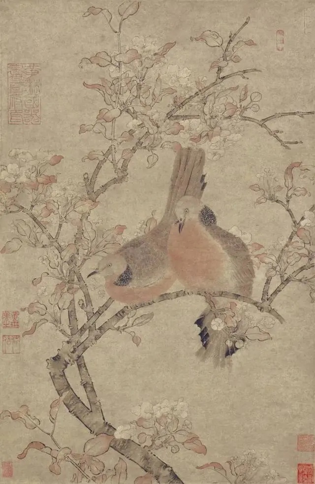 传为边鸾所画的《梨花斑鸠图》,描绘了两只斑鸠栖息于梨花树枝上的情景。需要说明的是,边鸾真迹由于世事变迁而大多被毁。据《宣和画谱》记载,北宋内府所藏边鸾作品仅有33幅,而至清代更是“世不多见”,至今已经没有一幅可以考据确认的边鸾真迹传世。既然清代仍然有边鸾真迹可见,那么明人所画传为边鸾真迹的花鸟画作品应该是有所依据的,可以作为我们评析边鸾花鸟画艺术特点的佐证。