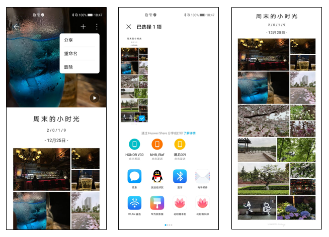 除此之外,在时刻展示的页面,增加了一键分享时刻图片的功能。当你点开一个时刻,点击【更多】-【分享】,杂志化的时刻展示界面便可以自动生成图片,选择你想发送的好友可以实现一键分享时刻图片,让你的时刻精彩与好友共同分享。