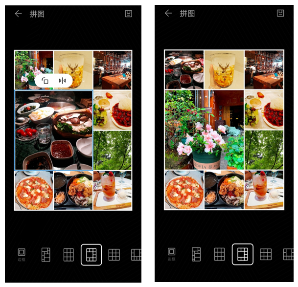 新版本的华为图库拼图功能支持2~9个照片素材的拼图,共有52种基础拼图模板和29种美学拼图模板。在拼图模板中可实现对照片的交换,缩放、旋转和镜像的操作。
