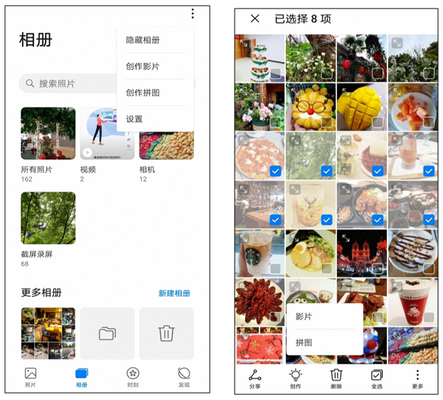 拼图功能共有两个拼图入口:华为图库照片页、相册页、时刻页及发现页点击【更多】—【创作拼图】,任一相册中勾选2~9张图片点击【创作】—【拼图】即可进入拼图界面。