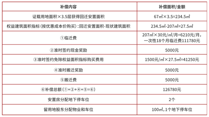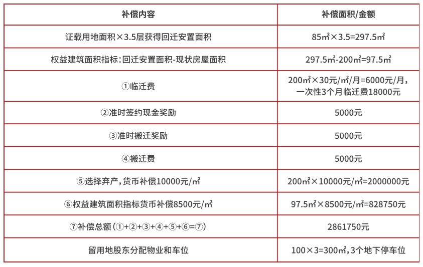 答:选择货币补偿的,其现状实测建筑面积按照10000元/m2的标准计算货币补偿,而属 于回迁安置权益建筑面积指标的,则按照8500元/m2的标准计算补偿。