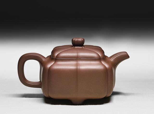 此《僧帽壶》师法顾景舟,其壶型把握工艺追求均已与顾景舟原件达到乱真效果。此壶造型源于明代紫砂先师时大彬,顾景舟在时大彬基础上进一步化繁为简,线条更为简练,气质更为高绝。作者此件作品尽得两位宗师僧帽壶之真传,棱角分明、精雅独到,整体给人以刚健挺拔、神韵自若之感,多片镶接,工艺繁复,因此为世人称绝。