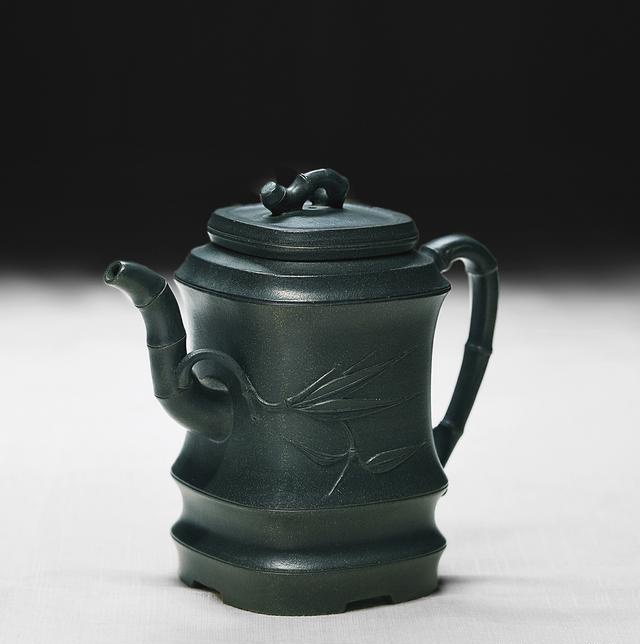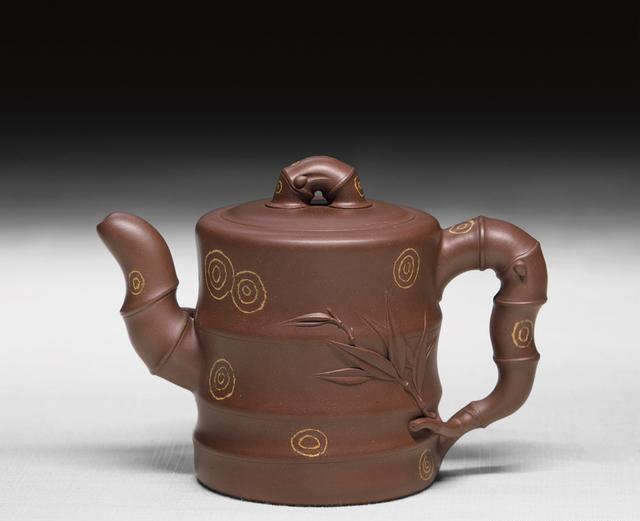 湘妃竹向来是中国传统文人喜欢的文玩材质,紫砂常用来模拟湘妃竹的形态,其做法是在壶身尚为生胚之时,刻出湘妃竹圈型纹路,并在纹理间嵌入黄金段泥,以形成竹斑。这样的工力,能够制造的不少,能做到如此惟妙惟肖的却凤毛麟角。