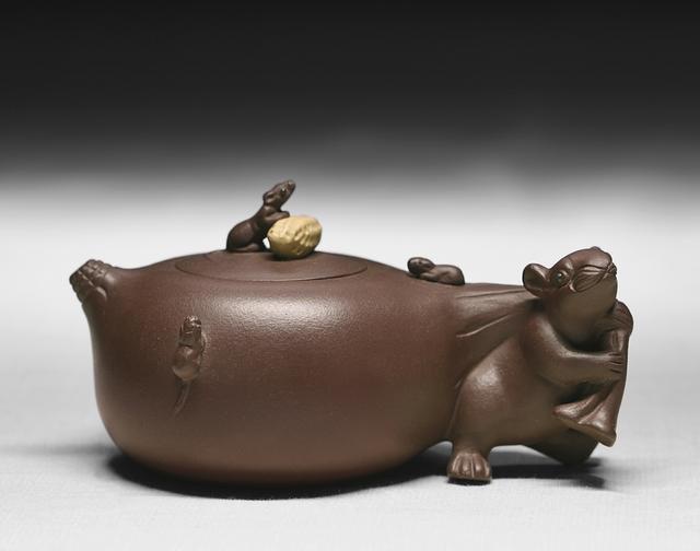 作者选用珍贵原矿老紫泥,全手工抟制。原矿老紫泥泥料油润,在表现上非常适合立体感很高的褶皱雕塑的壶型,成壶后呈现特有的丝质感。在制壶工艺上,作者在所传承的手工技法上又在其形体上做了创新。这种艺术个性与风格对作者的制作功底和审美意识有极高的要求。《五子登科》宛如一个装满食物的大布袋,硕鼠尽力地拖着它前行,壶之把由此而省略。其寓意象征年年有运岁岁丰收。