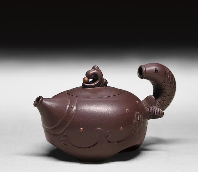 此壶以跳跃龙门的鲤鱼为倒提把,只要按住鱼嘴即能实现随时断水,既炫技亦实用。巧思和难度兼具。作品以传统器型为基础,壶正后面都是浪花造型,鱼跃龙门时波涛汹涌的气势,形象生动,跟整壶相呼应。以水浪为壶钮,跳跃的鲤鱼做壶把,栩栩如生,把上鳞片刻画清晰,鱼头生动形象与整壶统一。寓意美好,俗话说鱼跃龙门,过而为龙,寓意实业成功或地位高升,构思寓意深厚。壶身整体线条感强,精致耐看,风格线条流畅,点线面挺括,端庄大方,制作精细,手工浮雕难度高。
