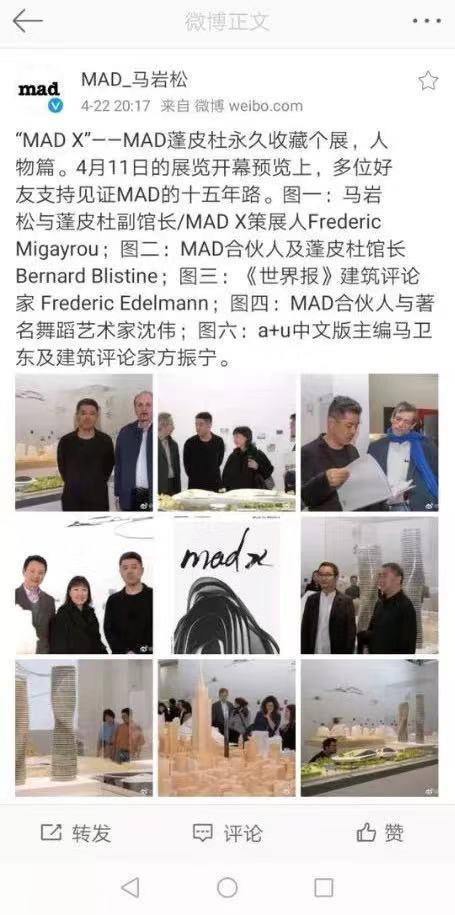 这个展览不大,但来了不少有身份的人,除了策展人和馆长之外就是在MAD成长过程中给以一臂之力的中外好友。馆长穿的就是和一个普通的市民一样,马岩松差点没认出来他,如果不是合伙人党群提醒,那个人就是去过咱们事务所的蓬皮杜馆长,赶紧去打个招呼啊,否则这馆长没准准备回家了。
