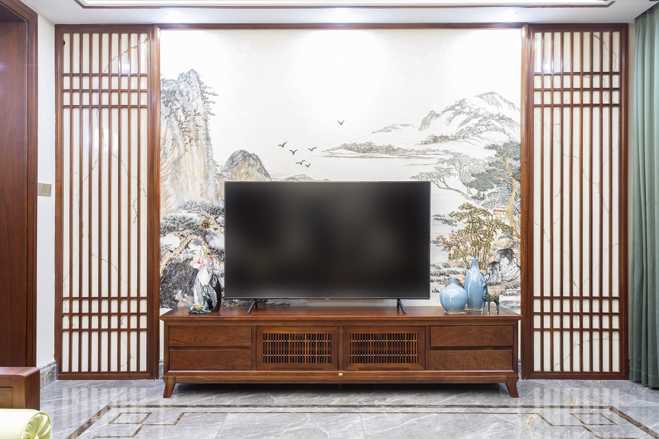 相对而言,新中式风格注重一种对称美,包括电视背景墙,采用的都是对称结构。客厅的新中式沙发采用3+2的组合方式,使整个空间更加充实。