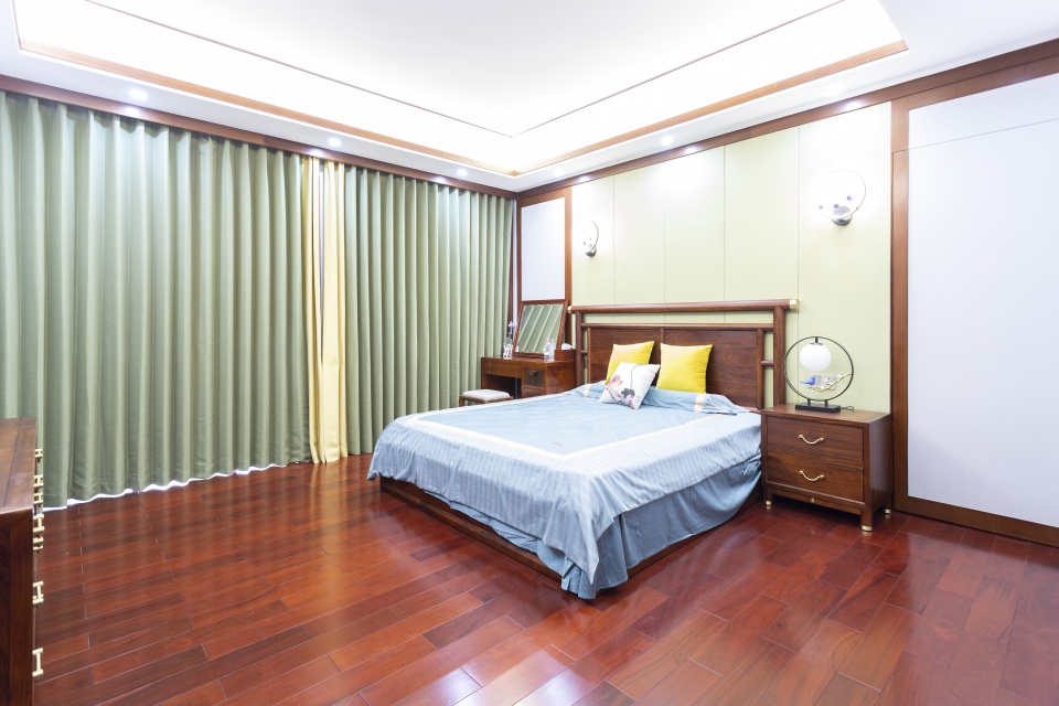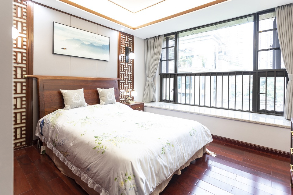 卧室的整个卧室空间相对较大,新中式实木床和床头柜加入,使整个卧室布局更加合理,整个空间更具有现代感。 还想了解更多新中式家具、以及新中式家装相关内容欢迎关注!