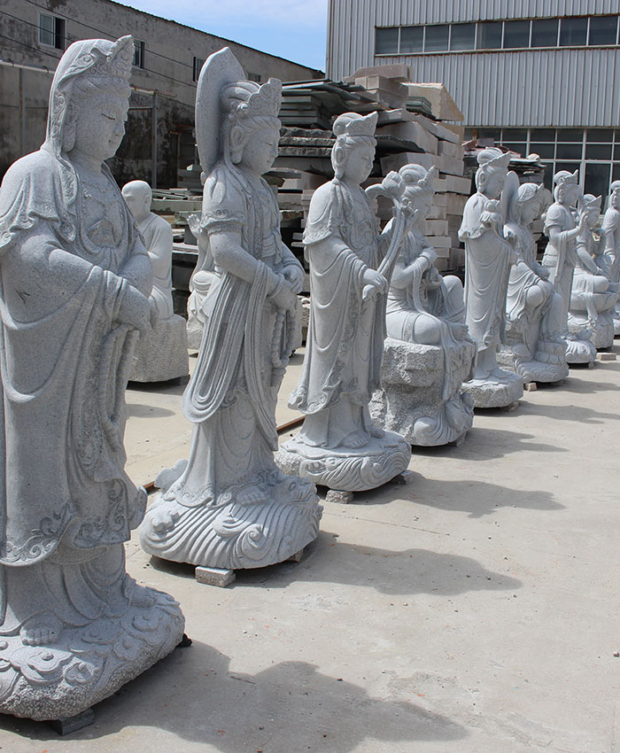石雕观音作为众多雕刻佛像艺术种类之一,供奉在寺庙是最常见的,但是随着一些宗教景观区广场的建设,一些大型观音石雕也出现了市场,现今常使用花岗岩石材雕塑观音有:青石观音雕像、锈石观音雕塑、白麻石观音雕塑等。根据了解,从古代能够流传至今且保存完整度较高的佛像都是石材制作的佛像,古代观音佛像使用的花岗岩石材不易风化,耐腐蚀,保存时间长的特性,使观音石雕不管是供奉在室内,还是历经千百年摆放户外的都能够经久不衰。其实能够雕刻的还有泥、铜、木料等,但都远不及石料好用。因此我们常看到的广场上的大型花岗岩观音,还是青石观音不管什么造型都能够维持很好的状态。