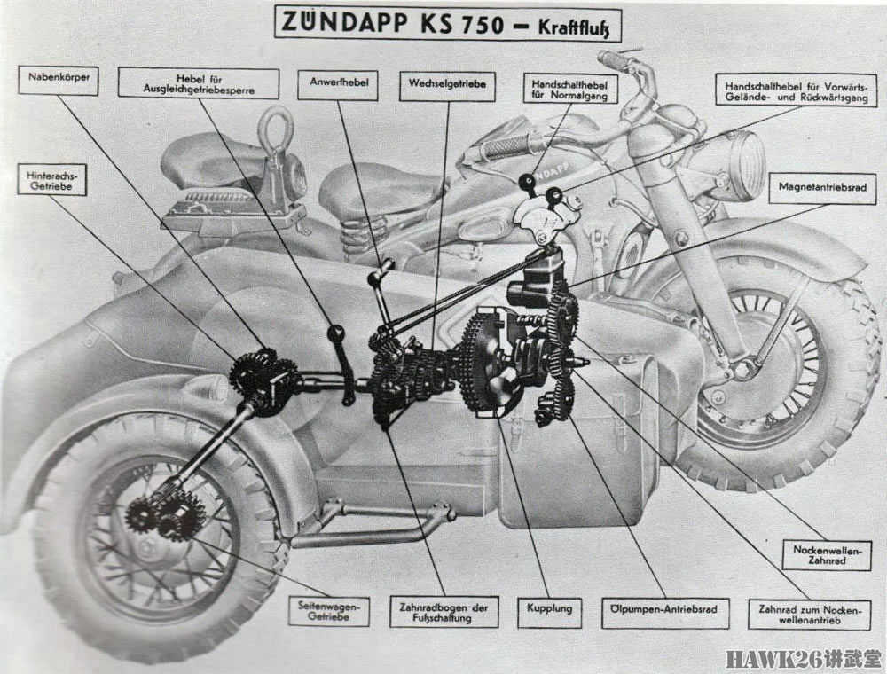KS750采用轴传动方式,为了越野需要,作为整体的一部分,KS750的挎斗车轮有传动装置。并且设计有倒档、公路档、越野档和可锁定的差速器,可以将动力的70%分配给后轮,30%供给挎斗车轮。