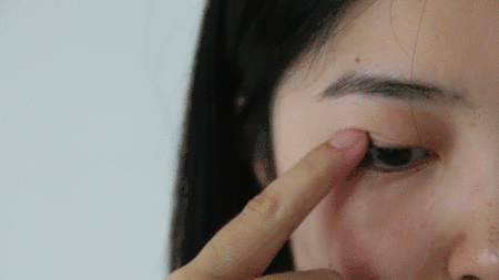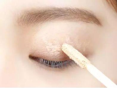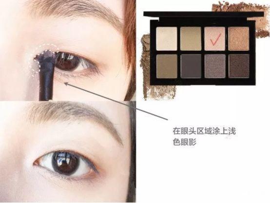 小贴士:单眼皮非常容易晕妆,所以一定要做好眼部打底。可以使用专门的眼部打底产品,在眼皮上点涂几下然后涂抹均匀即可,如果没有眼部打底产品,也可以使用眼影盘或者眼部遮瑕盘的浅色膏体部分代替。