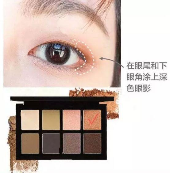 ③、用深色的眼影涂在眼尾及下眼睑处,可以拉长眼尾,眼睛看起来更大。