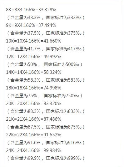 国家标准GB11887-89规定,每K(英文carat、德文karat的缩写,常写作"K")含 金量为4.166666%,我国的K金在新中国初期是按每K含纯金4.15%的标准计算的, 1982年以后,已与国际标准统一起来,每K含金量为4. 166%。通过这些可以算出 所购买K金的纯度。