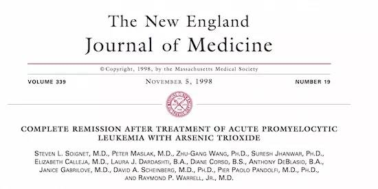 直至1992年,哈医大一院的张鹏团队首次将三氧化二砷单体直接同APL单病联系在一起,并从1995年6月开始,在国内外率先发表了3篇论文。这被认为是最接近规范化临床试验所取得的单药治疗及随访结果临床论文。
