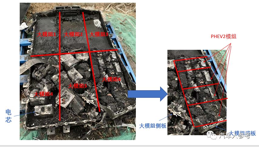 最近一位朋友发送了某车企某款车型电池包热失控实验后的照片,算是目前能找得到的CTP实物。整个电池包烧掉后,里面电芯和大模组排布一览无余。