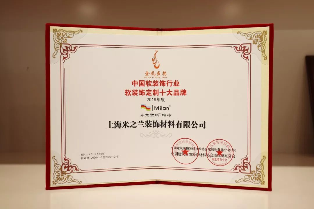 热烈祝贺中国建筑装饰装修材料协会定制软装饰分会正式成立,恭喜米兰壁纸墙布2019年度完美收官,斩获金孔雀奖暨软装饰定制十大品牌、墙纸墙布行业十大影响力品牌、最佳设计创意奖等诸多奖项,闪耀全场!