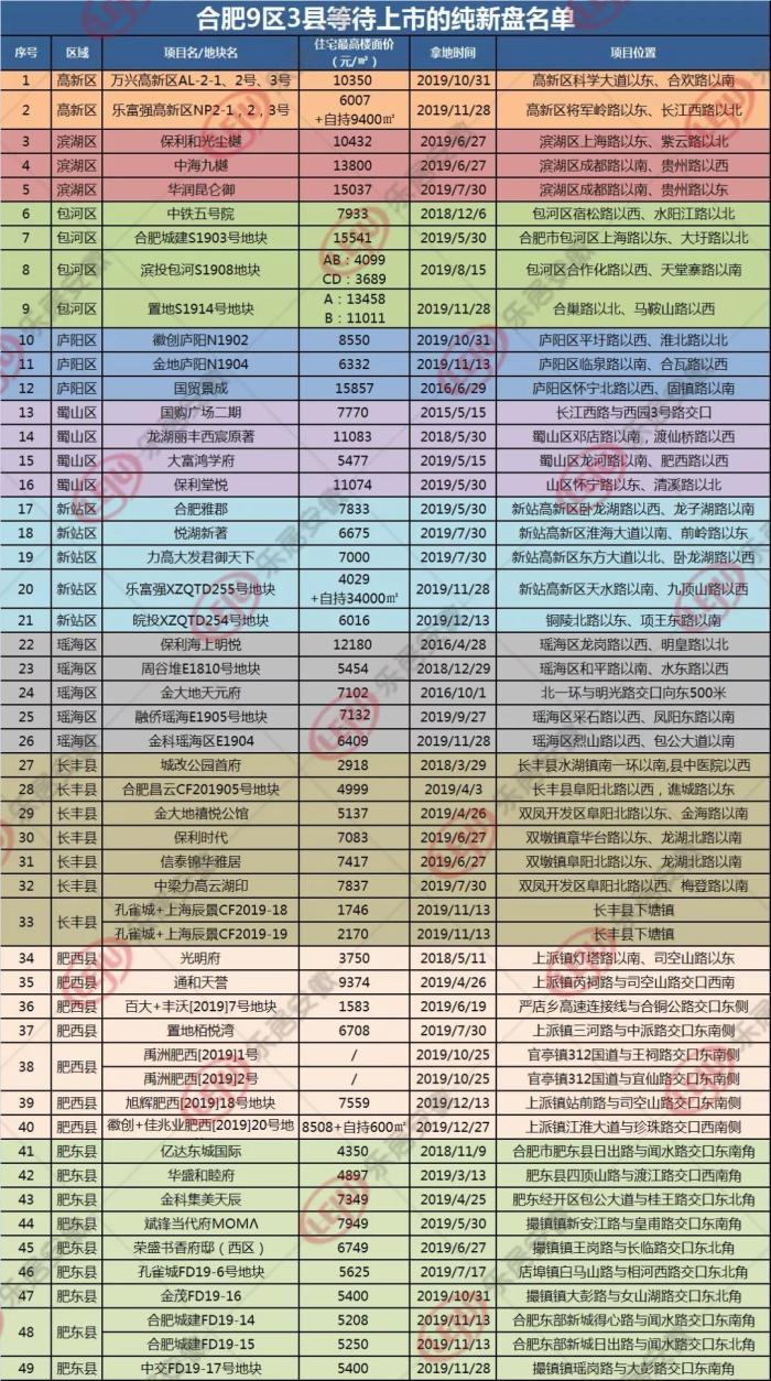 目前合肥九区三县共有49家纯新盘,滨湖中海九樾、庐阳国贸景成、蜀山龙湖丽丰西宸原著、新站区合肥雅郡、长丰县保利时代、中梁力高云湖印、瑶海区金大地天元府等盘或将年前入市。
