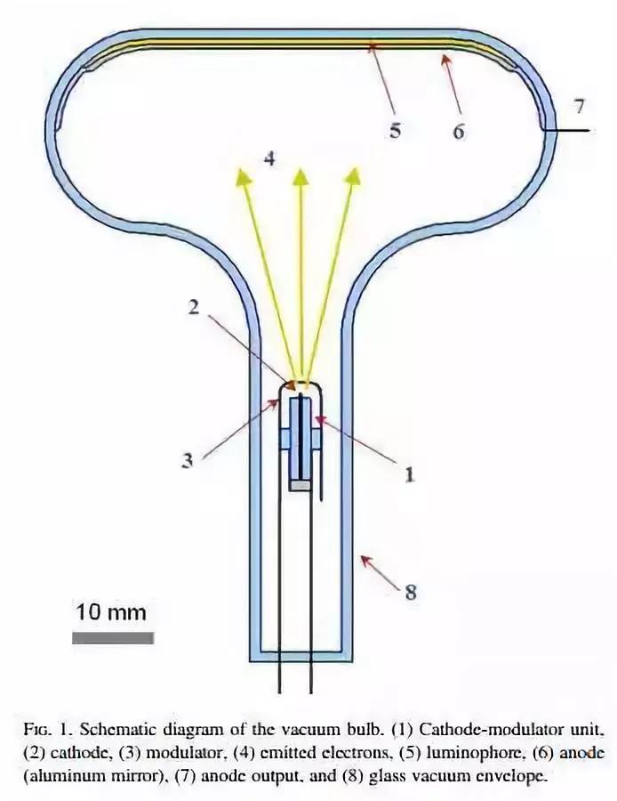 阴极射线发光灯:①阴极调制器单元、②阴极、③调制器、④发射的电子、⑤磷光质涂层、⑥作为阳极的铝镜、⑦阳极输出、⑧玻璃真空管