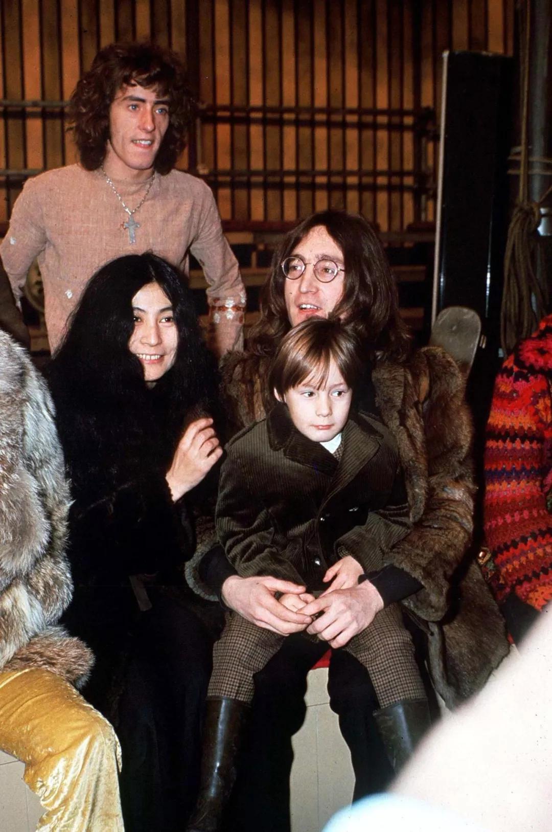 Yoko Ono and John Lennon hold his son Julian on the set of The Rolling Stones Rock and Roll Circus, 1968.