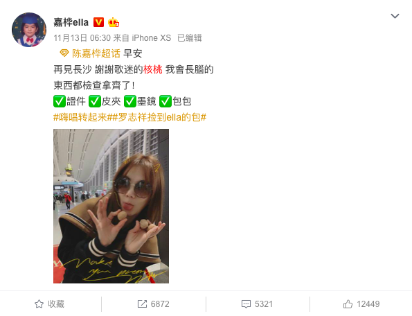 近几年,陈嘉桦Ella活跃于《王牌对王牌》、《蒙面唱将猜猜猜》等多档内地综艺节目中,让很多观众认识到音乐实力突出的她,还是一枚情商超高、好玩又搞怪的“宝藏女孩”。就在不久前,罗志祥在微博发布了一则“失物招领”,声称捡到了钱包和眼镜,没想到陈嘉桦Ella迅速在线认领,惊呼自己直到看到微博才发现丢了东西,需要补脑,此番言论也是实力自嘲了。陈嘉桦Ella后续更是晒出了粉丝送的核桃,完全就是一个“接梗达人”!