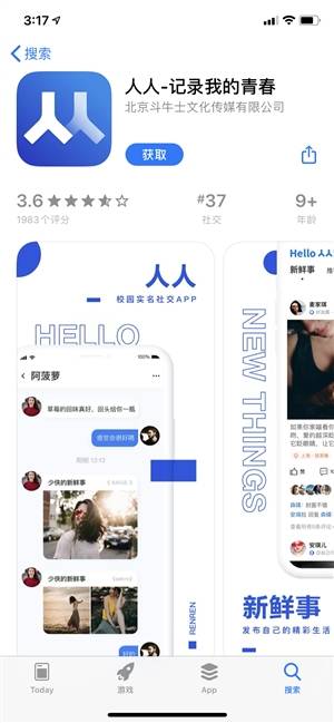 全新的人人APP依然主打年轻人社交,主宣传语为“纪录我的青春”。