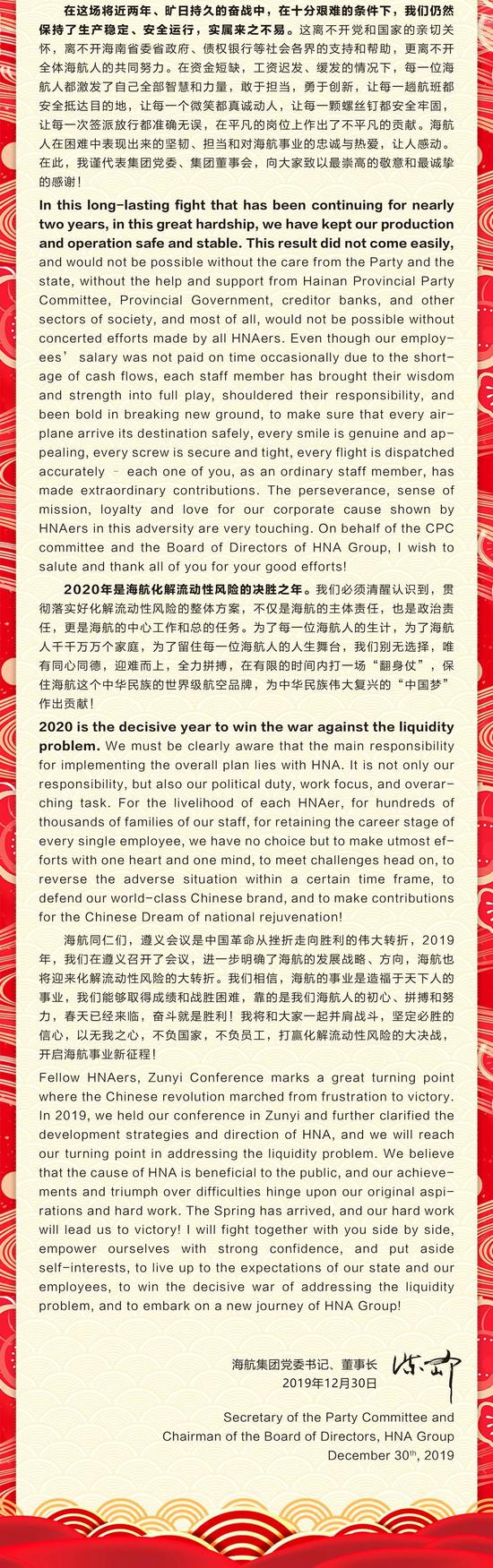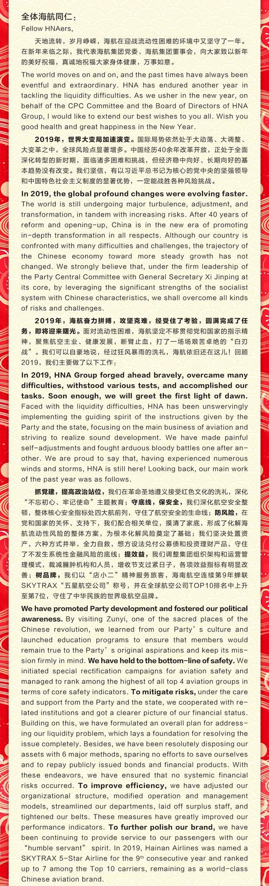 天地流转,岁月峥嵘,海航在迎战流动性困难的环境中又坚守了一年。在新年来临之际,我代表海航集团党委、海航集团董事会,向大家致以新年的美好祝福,真诚地祝福大家身体健康,万事如意。