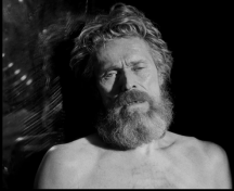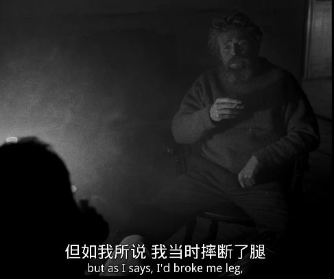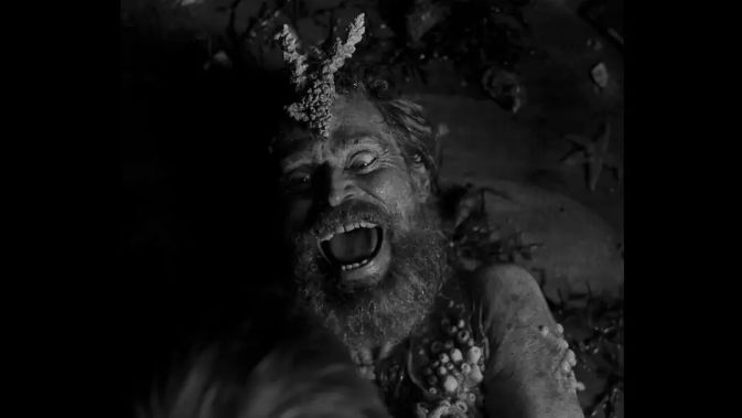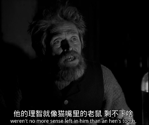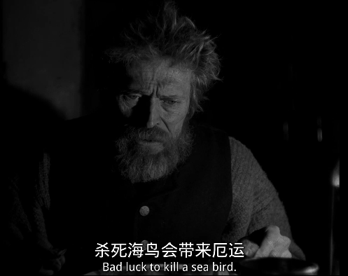 老者叫托马斯·威克(威廉·达福 饰),自称曾经是个水手,粗鄙嗜酒,屁声连天,整天念叨着曾经出海的种种际遇,和令人不舒服的,怪异险恶的迷信。