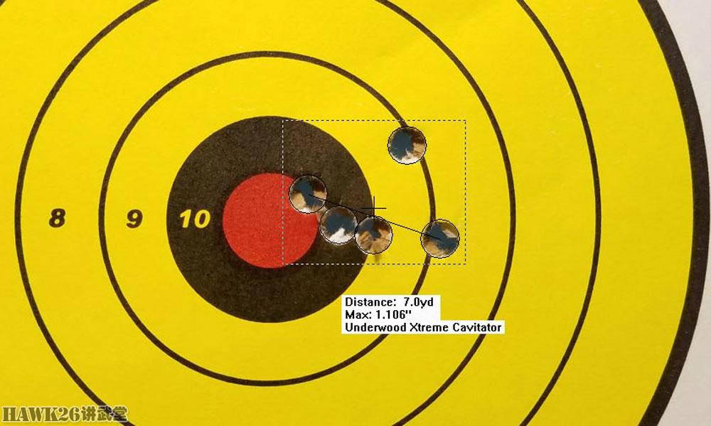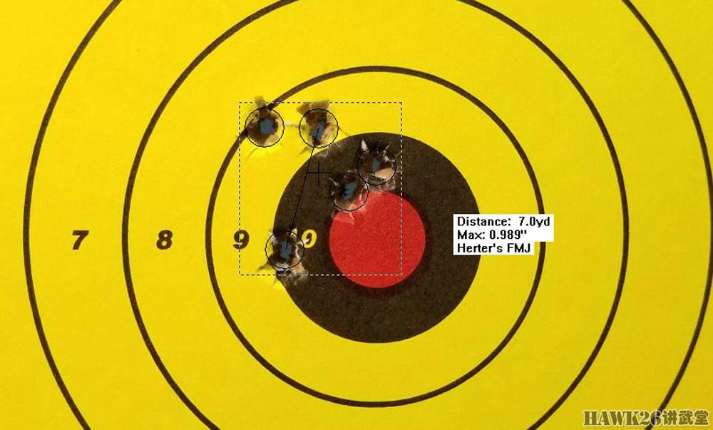 精度测试距离6.4米(7码),一组五发,散布圆直径在25mm左右。