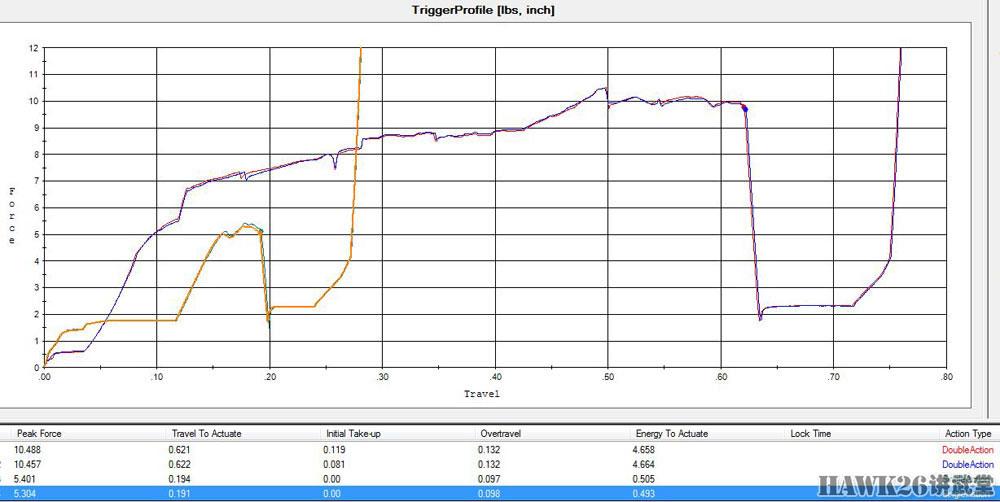 这是扳机在双动(蓝色)和单动(黄色)状态时的力量和行程曲线:双动时扳机力达到46.7 N,非常沉重;单动时为24.5 N,尽管中规中矩,但仍有优化的空间。从这个力量曲线同样可以看出,扣动扳机过程并不顺滑,这与扳机组件加工和装配质量相关。