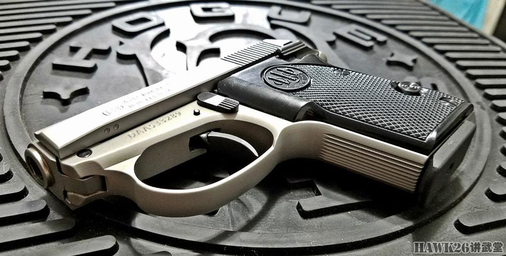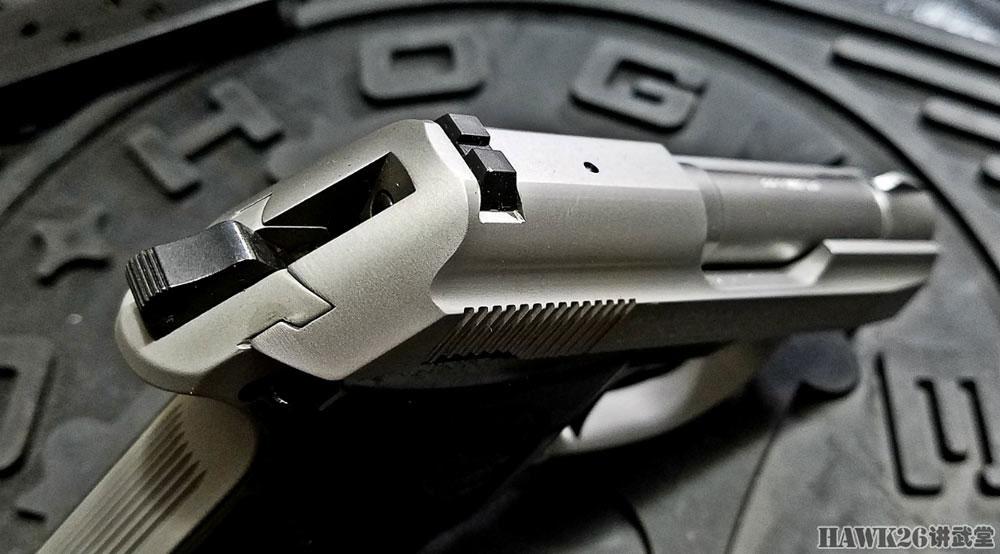 顺便说一下,准星设在不锈钢枪管上,是一体加工出来的。这对枪械装配精度提出了很高的要求,不过从测试结果上来看,贝雷塔做得非常出色。银白色不锈钢准星配合黑色照门非常醒目,便于快速瞄准射击。结合较低的后坐力,“汤姆猫”绝对是非常理想的自卫武器。