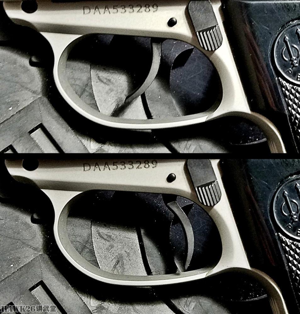 上图为扳机初始位置,下图为压倒击锤后扳机单动时的位置,无论哪种情况扳机力都很沉重,这影响了该枪的某些评价。