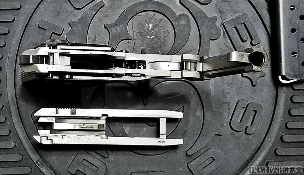 该枪的不完全分解非常简单将枪管翻转到最前方,稍微向后拉动套筒,然后向上拉,就可以将套筒取下。