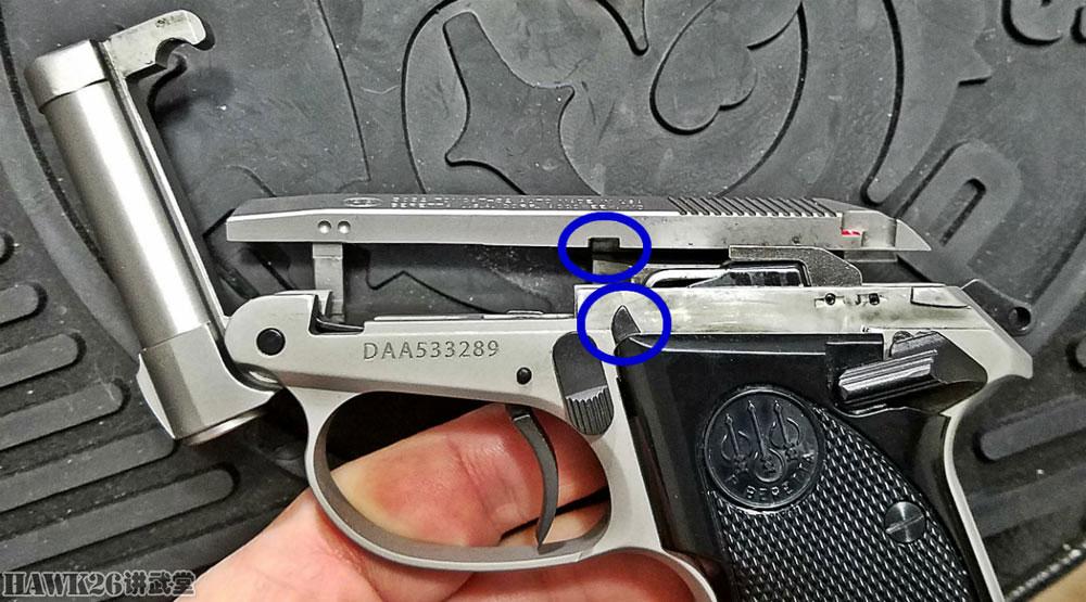 不完全分解状态下没有复进簧或类似的组件。注意握把护板上的尖端(篮圈所示),与套筒上的凹槽相互配合。这支手枪的复进簧在握把内,通过这个小的装置来驱动套筒。套筒座左侧有一个手动保险,可以锁定已经压倒的击锤。尽管这支手枪并没有空仓挂机功能,但通过打开枪管,可以直接取出枪膛内的弹药,然后再扣动扳机让击锤复位,这样做安全系数更高。