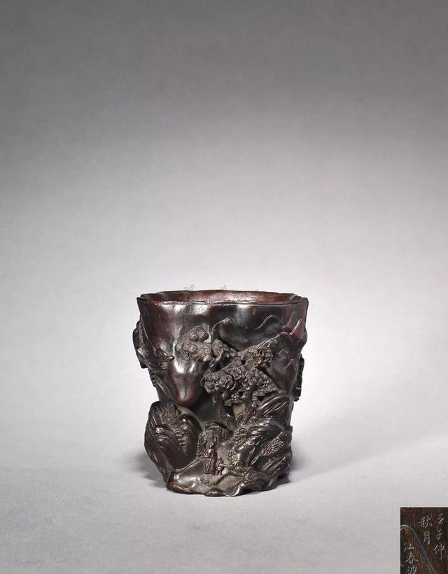 山水人物纹沉香杯,刻“壬子仲秋月江春波制”款。江春波是明代晚期重要的沉香雕刻家。故宫收藏中有一件与之形体非常相近的沉香笔筒,款识风格也完全吻合。综合各方面的表现,这是一件可以证实的江春波的重要作品,甚至可以认为是其作品中最优秀者。