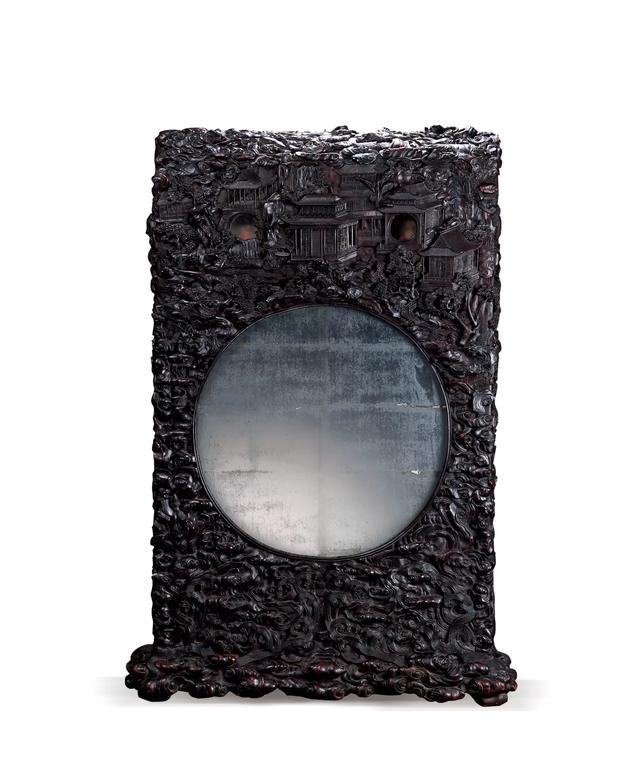 沉香拍卖榜第2名 清乾隆 御制沉香雕仙山楼阁嵌西洋镜座屏