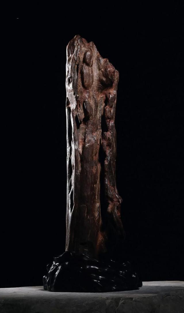 笔筒随形,波折不整,身形自然,用刀犀利,打磨光滑,技法纯熟,风格高雅,浑然天成,别有旨趣,下配黄花梨底座,凿痕斑斑,虽与筒身木质有别,然雕刻风格上下浑然一体,古朴、旧气。沉香外壁高浮雕千年苍松,苍劲有力,盘曲嶙峋,凹凸蜿蜒,游走四壁,殊为精绝,内壁光素无纹,有一层古旧的大漆皮壳。此笔筒不仅取材别致,且构思巧妙,雕琢精湛,包浆浓厚,色泽莹润,充分体现了明代文人高雅的生活情趣。
