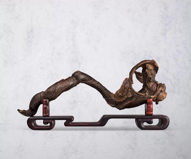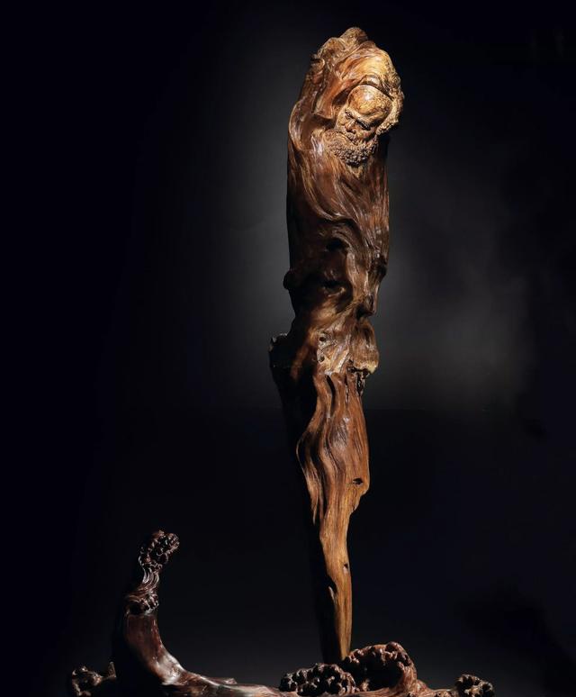 此作选材印度尼西亚红土沉水香材,取达摩祖师的典故《一苇渡江》,琢法惜料如金,采用局部雕手法刻画达摩祖师的面部,其余皆保留原料天然造型,配以珍品海南黄花梨底座。只见达摩祖师脚踏芦苇,泛起朵朵浪花,似一叶孤舟,又似御风而行,飘飘然渡过长江,一代禅宗大师的风范跃然于眼前。