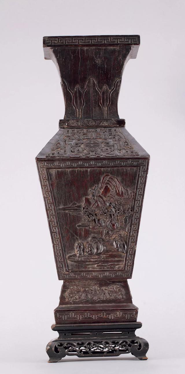 中华香文化浩如烟海,珍若珠玑。自唐宋至明清,上至宫廷,下至平民百姓都喜欢玩香、闻香。沉香为香中之魁,除用作香料外,由于沉香木质地柔和细腻,有一定韧性,并带有芬芳的气味,也逐渐成为雕刻用材的新宠。本件拍品选材硕大,色泽深棕,包浆温润古朴。瓶呈四方扁式,直口,宽沿,长颈,腹部向下渐收,圈足阔底,轮廓线条直爽有力,甚有刚劲之势。