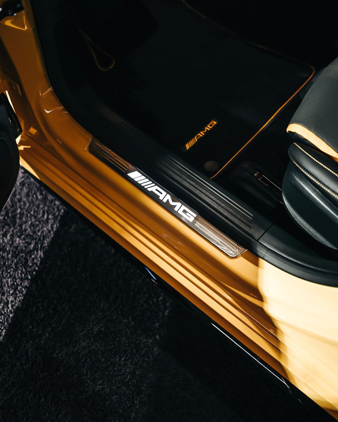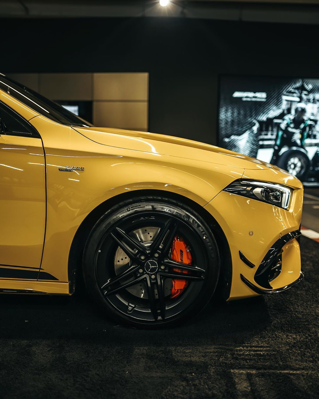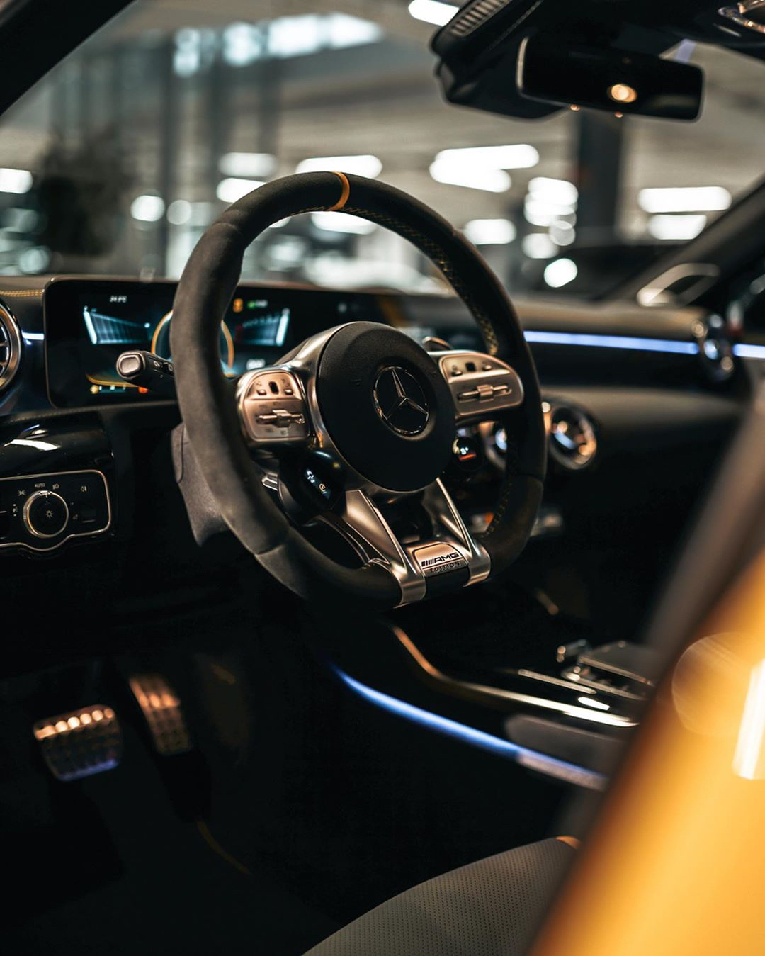 AMG A45 s拥有普通A级车内饰的所有优点和特点。根据性能车的基本要求,对细节进行了修改,主要是提高与驾驶相关的支撑性和防滑性。明亮的黄色装饰起到改善室内氛围的作用,也提高了一些辨识度。
