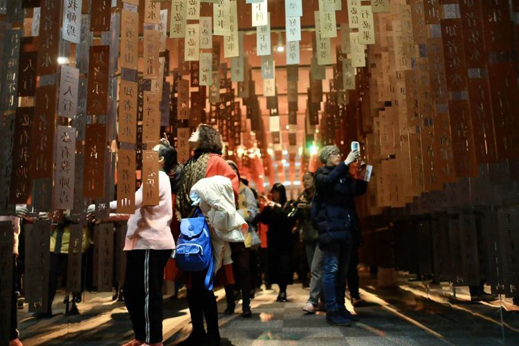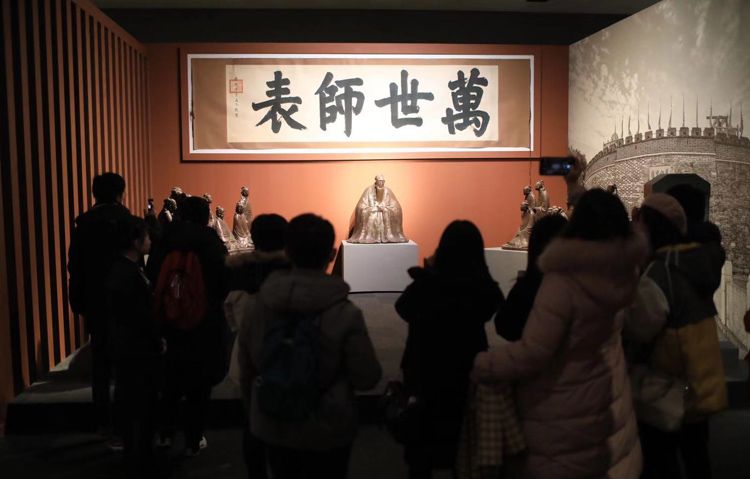 “幸运粉丝”在孔子文化展上的“论语镜墙”前驻足留影。
