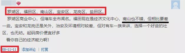 乐居君找到了一张评论当时各区发展的留言,10年前,深圳只有6个区域划分,南山也还是大众口中“相对差一点”的区域,但看看现在楼市的涨幅,西部崛起,东部渐缓,区域地位的转换真的是猝不及防。