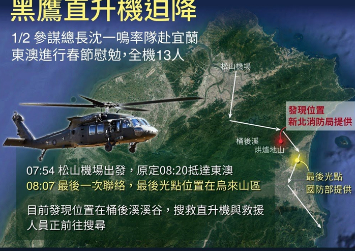 “参谋总长”沉一鸣上将、“政战局”副局长于亲文少将、情次室助理次长洪鸿钧少将及军闻社记者陈映竹,含机组人员共13人,上午7时50分搭乘UH-60M黑鹰直升机前往台湾宜兰东澳进行春节慰勉活动,因不明原因失事新北市乌来、宜兰交接处山区,灾害应变中心指出,救难队员在下午1时30分已接触待救者。