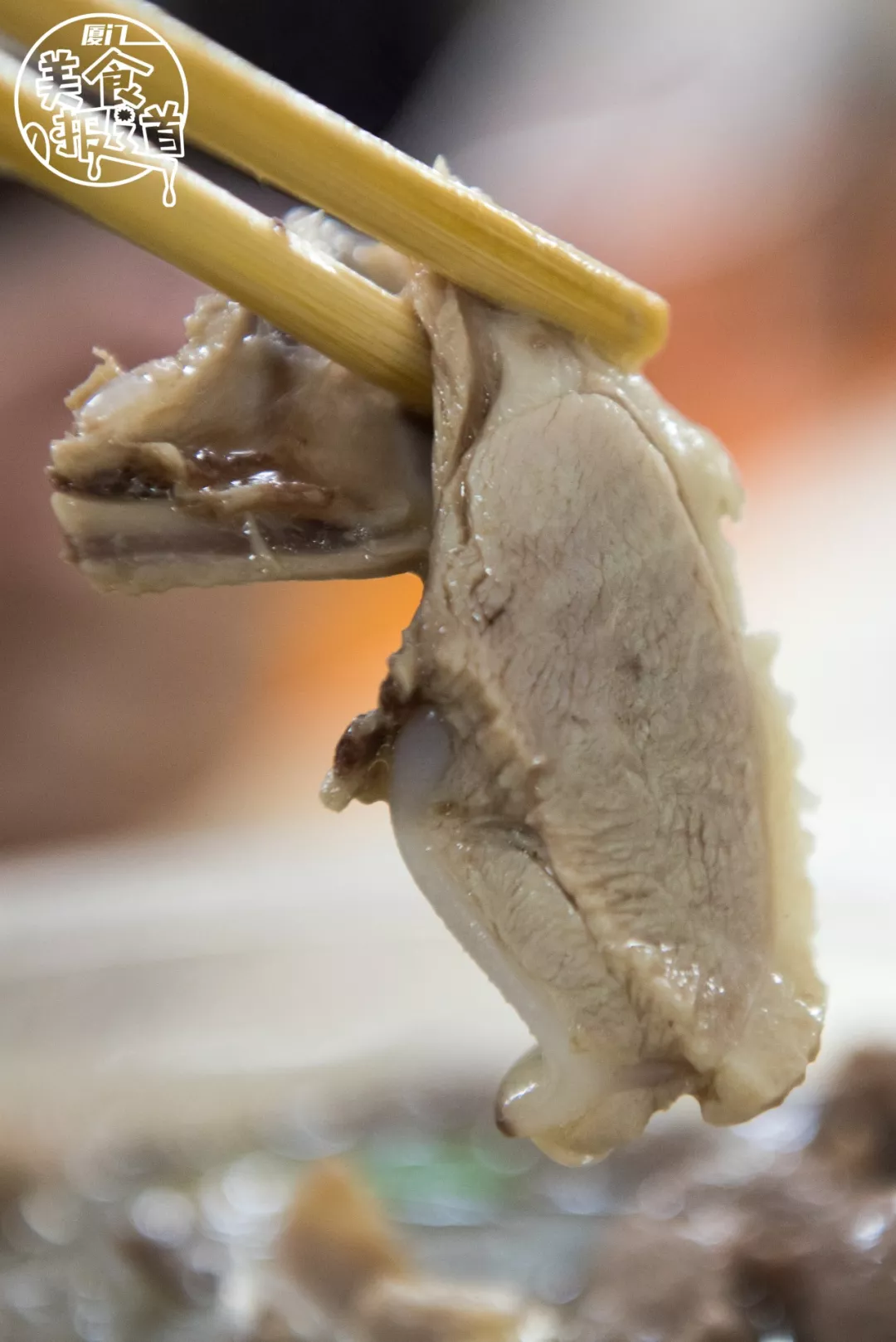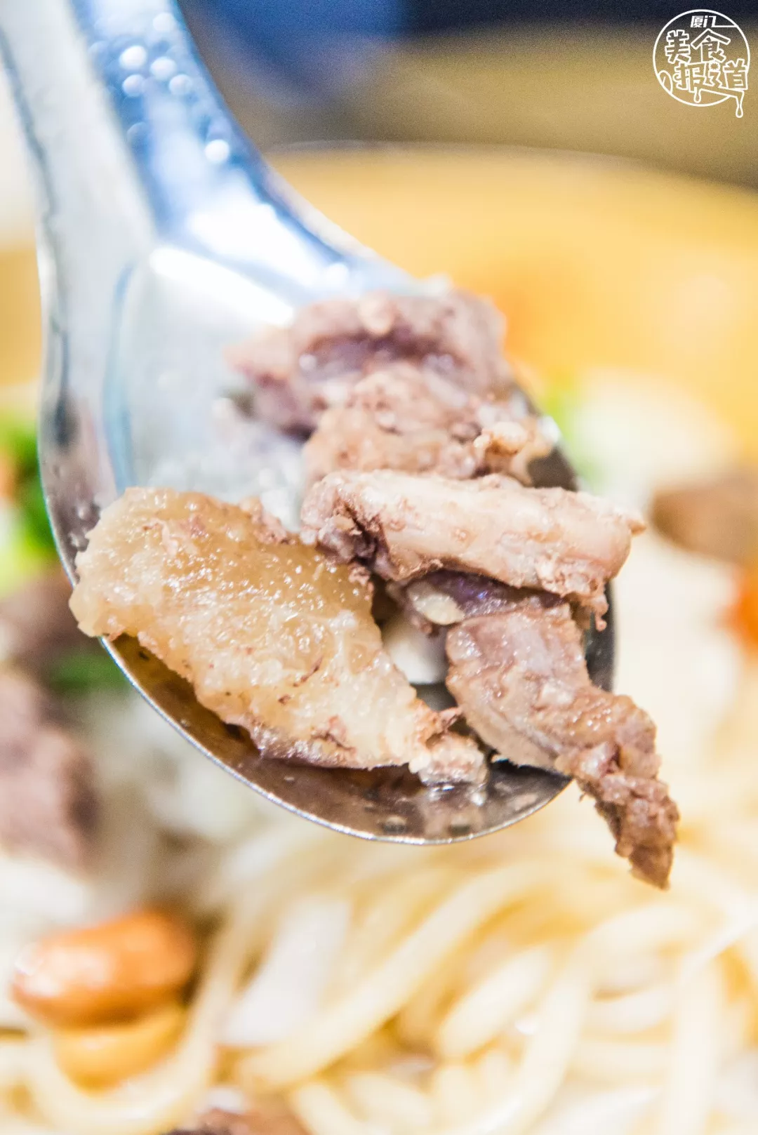 肥肉不是那种很扎实的肥油,而是质地松散的泡泡肉,会伴着一条煮的几乎化掉的筋,吃起来不会觉得肥腻,就算是瘦肉也是活肉,很劲道,不柴。