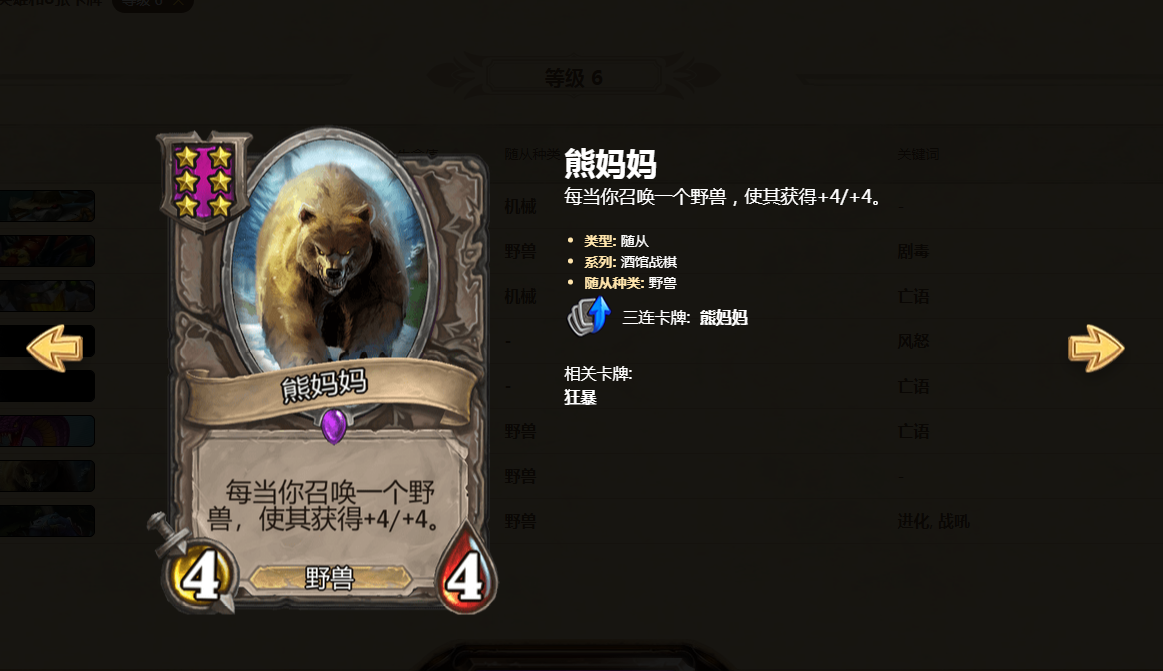 酒馆战棋中的野兽流在该新模式刚推出之时,在瓦娘野兽流的直播和攻略的影响下,成为了酒馆战棋中玩家们纷纷要玩的强力上分流派。从而引发了当时在在酒馆战棋中的第一个奇妙的现象“全民找妈妈”,就是在熊妈妈被削弱之前,玩野兽流的玩家纷纷速升5星碰对子找熊妈妈的玩法。但是,随着游戏面向所有玩家公测,熊妈妈也从55身材,buff效果+5/+5,被削弱成44身材,buff效果+4/+4之后,熊妈妈所代表的野兽流,退出了强势流派,被后面设计师不断增强的鱼人流所代替。时至如今,野兽流依然成为了玩家们在3星时期的鼠群+种族领袖+土狼的打工流派,一直没办法复刻以往的辉煌。