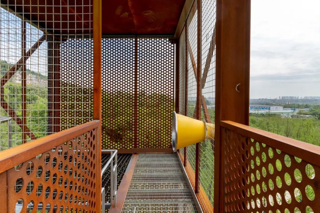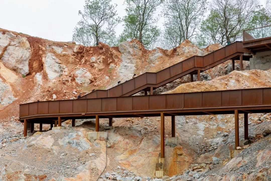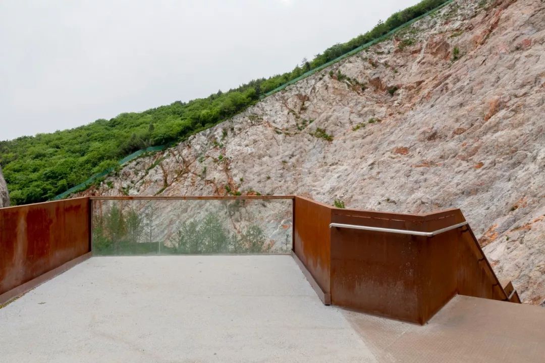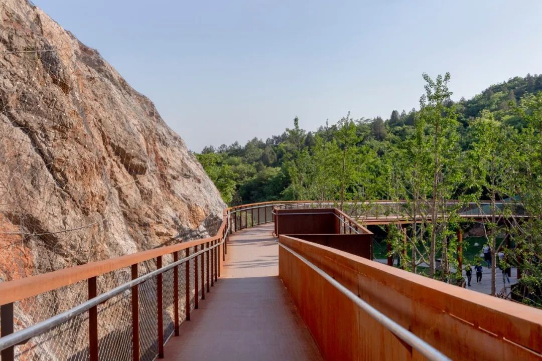 因此,为保持其具有石质质感的自然风貌,设计中尽量避免人工痕迹,用锈钢板墙、毛石荒料来表达曾经有过的工业时代气息;并利用现有山水条件,布置瀑布、天堑、栈道、水帘洞等与自然地形密切结合的内容,深化人对自然的体悟。同时利用山体皴纹,使其具有中国山水画的形态与意境。