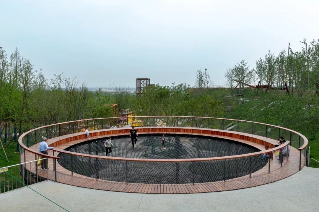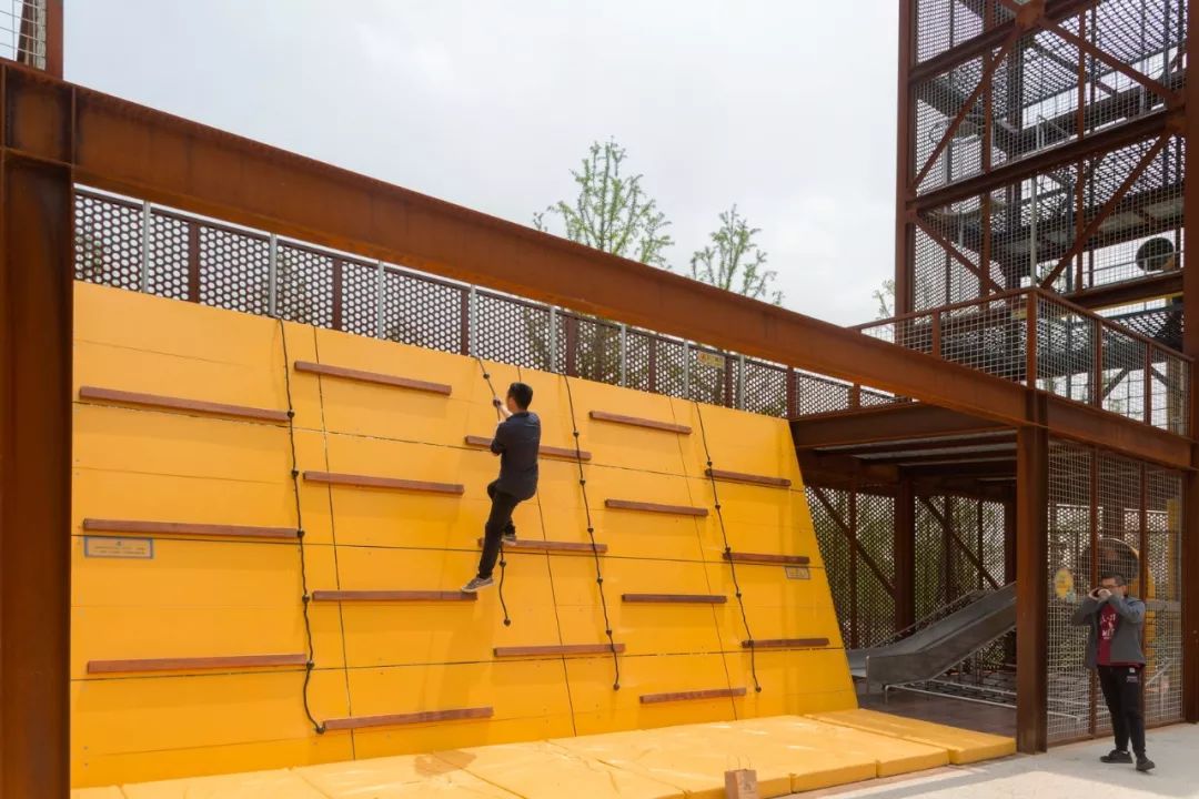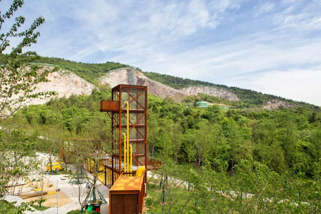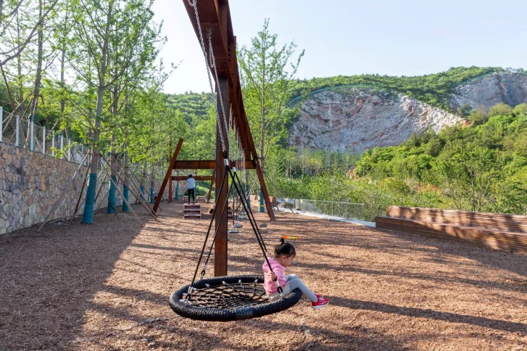 矿野拾趣乐园原为采石场堆放废料的地方,原有植被和水文已被完全破坏。根据现场条件,在恢复水文生态加固山坡基础上,我们将攀爬、滑梯、秋千滑索、蹦床等等活动设施组合在一起,形成矿坑特色的游憩场所。这是该项目目前最先完成的部分。