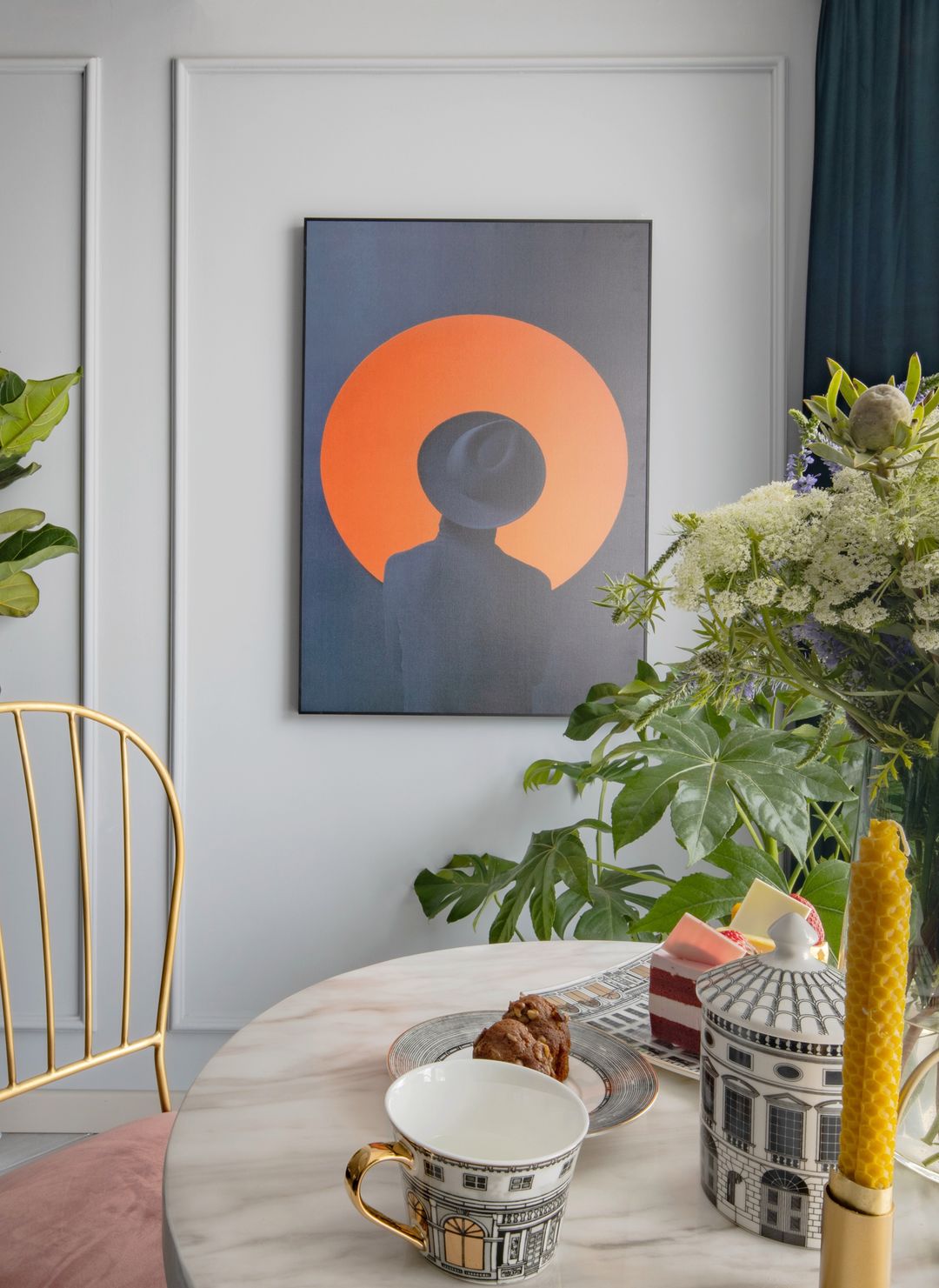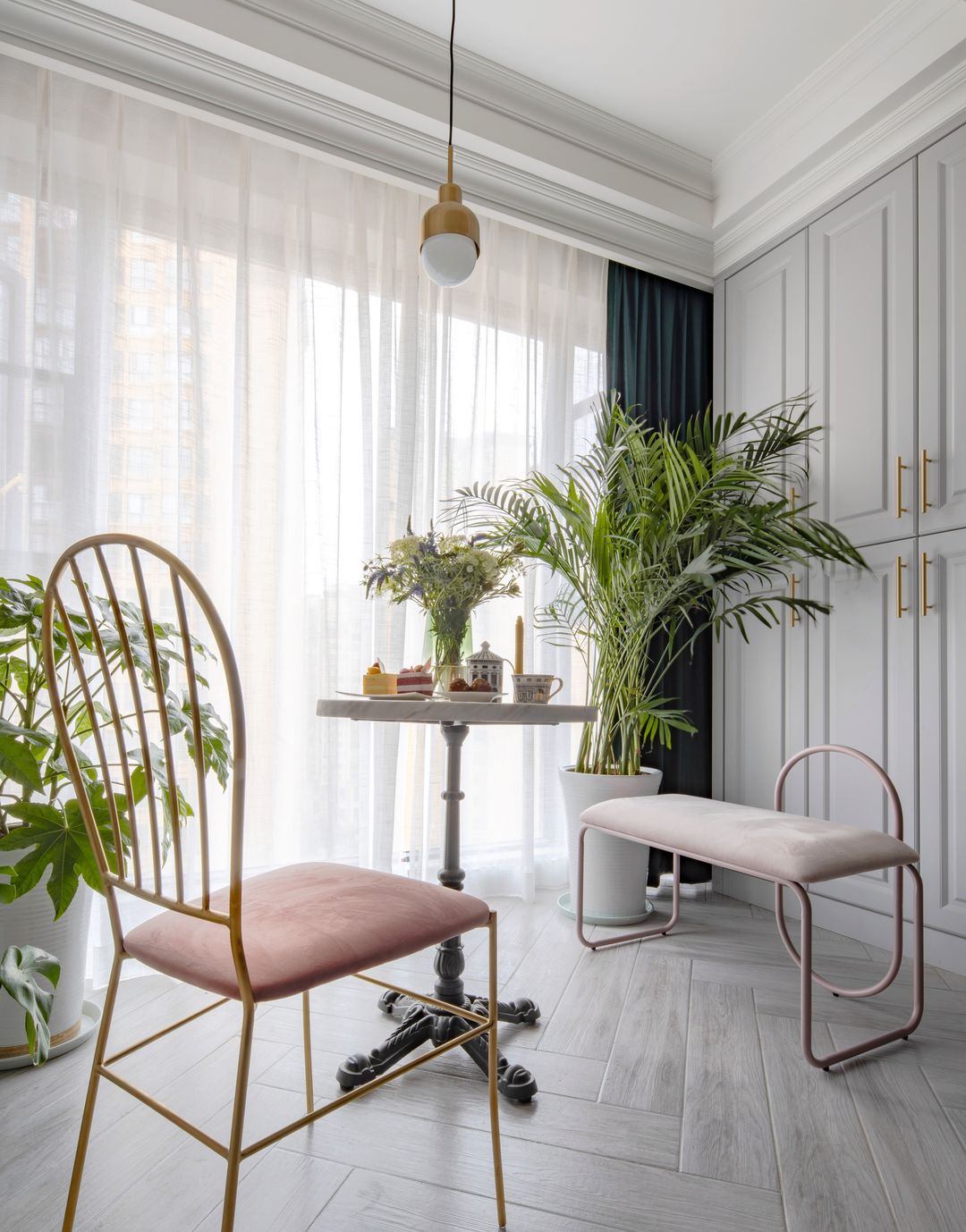 客厅生活阳台的一隅,一个小圆桌,让充满法式风情的浪漫在这里生根发芽。或许会成为和小姐妹交流的一个别致场所。
