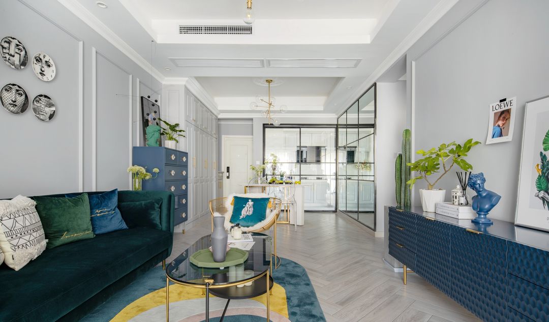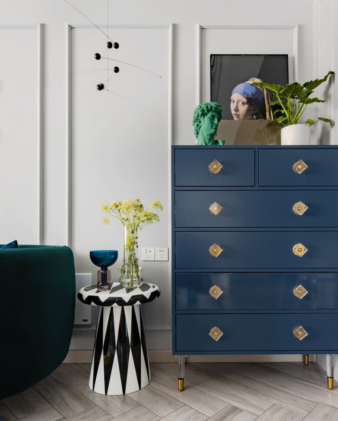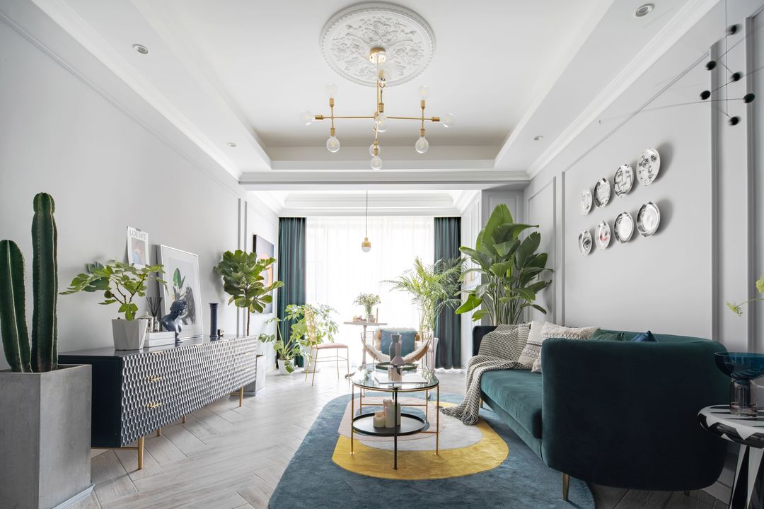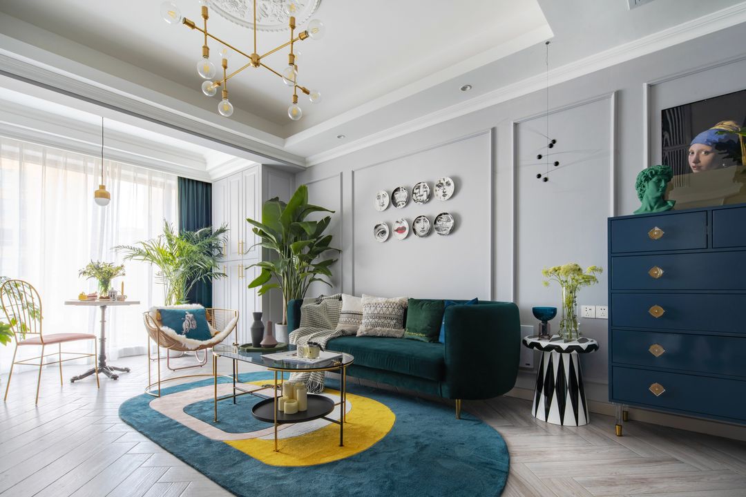 顶部选择了法式雕花造型再搭配黄铜灯,与茶几电视柜等黄铜元素相搭配。