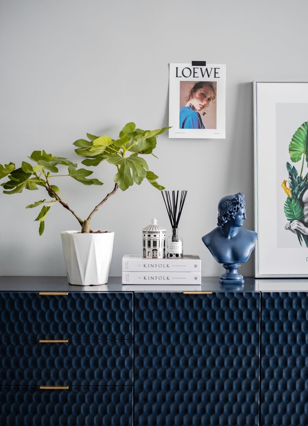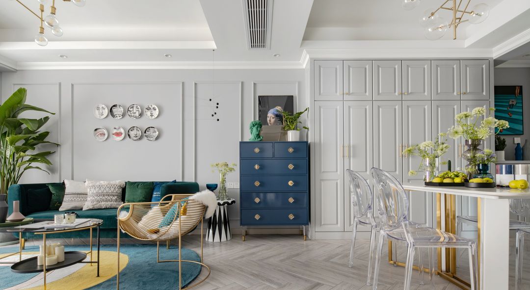 在餐厨区与客厅的中间的柜子也起到很好的过渡作用,从整体视角上来看,从右往左,不断变低,降低视线的聚焦点。