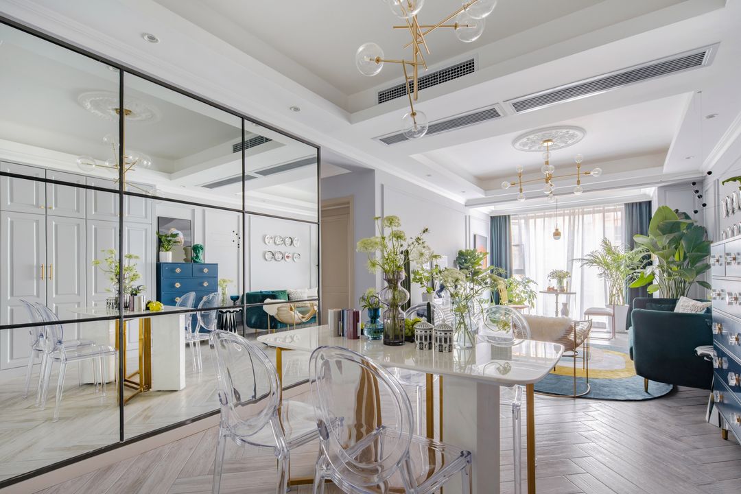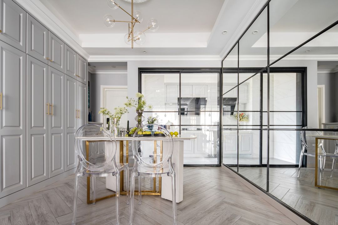 餐厅旁的大面十字格镜子,拓宽了视线,通过折射效果,让空间更为明亮,原本比较狭小的餐厅也变得更为宽阔。